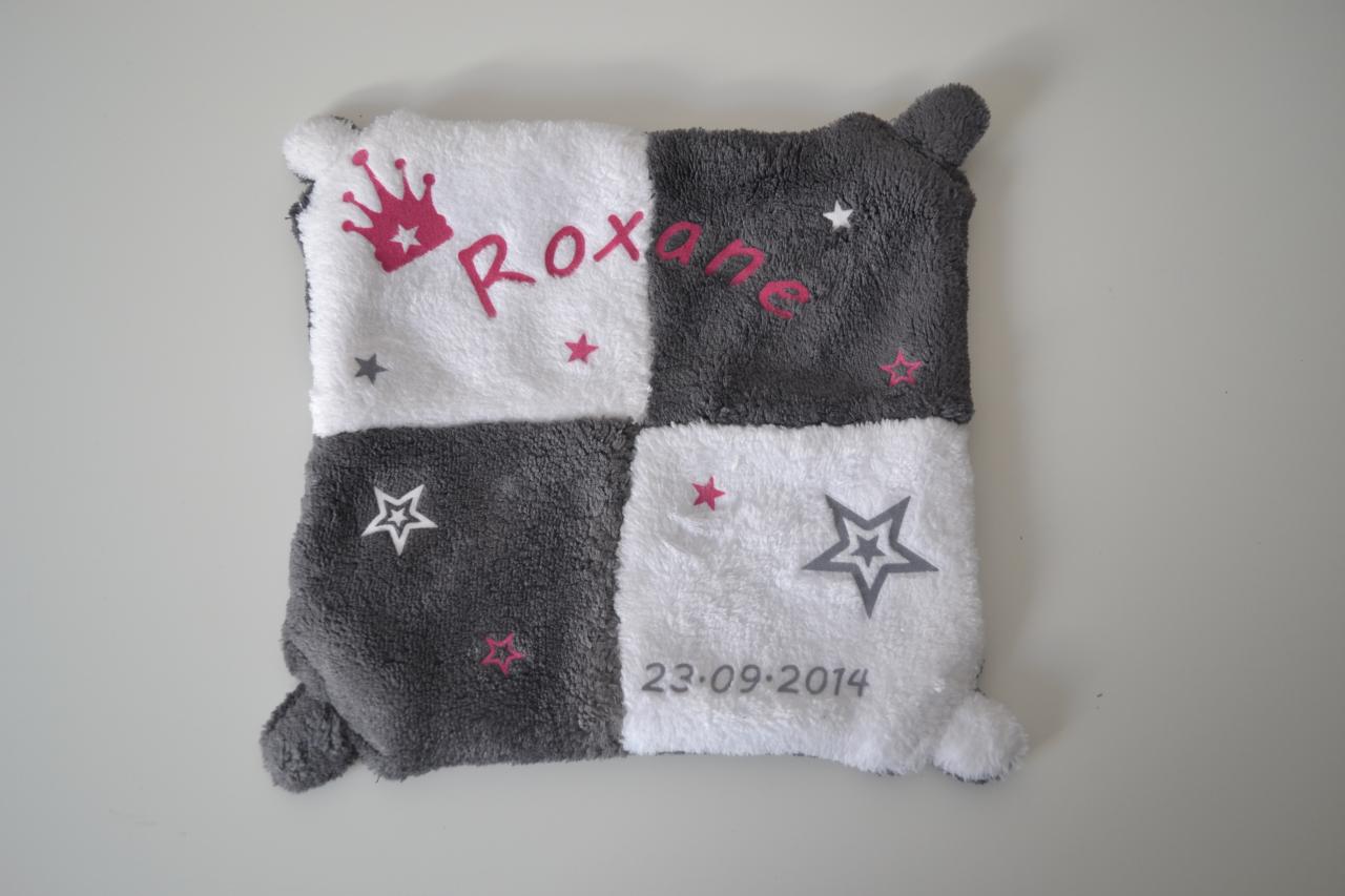 Doudou gris blanc avec marquage fushia velours, blanc velours et gris clair velours