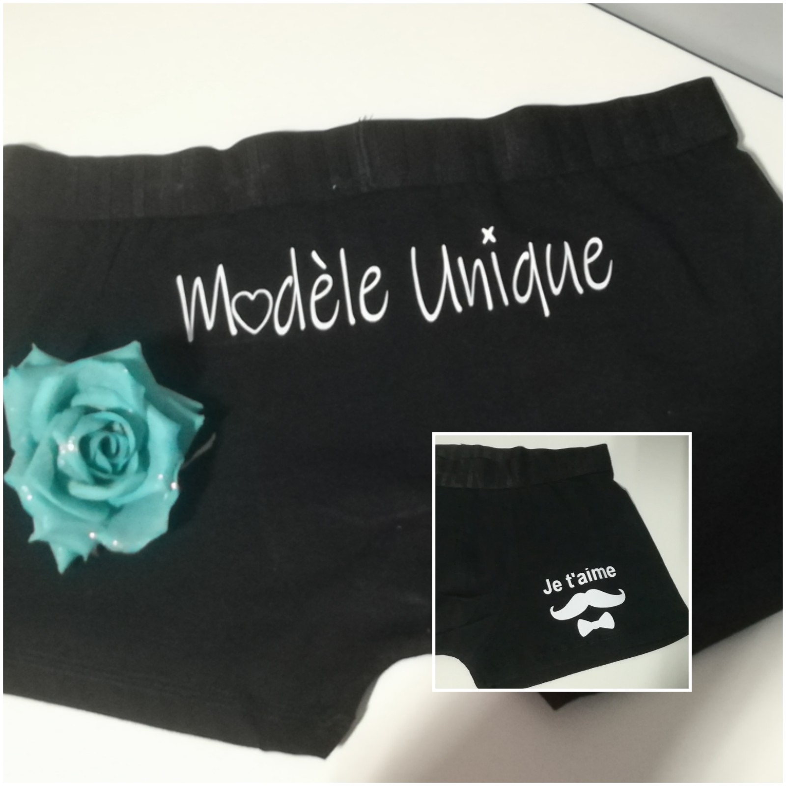Boxer homme modèle unique au dos du caleçon et devant en bas je t'aime moustache et noeud