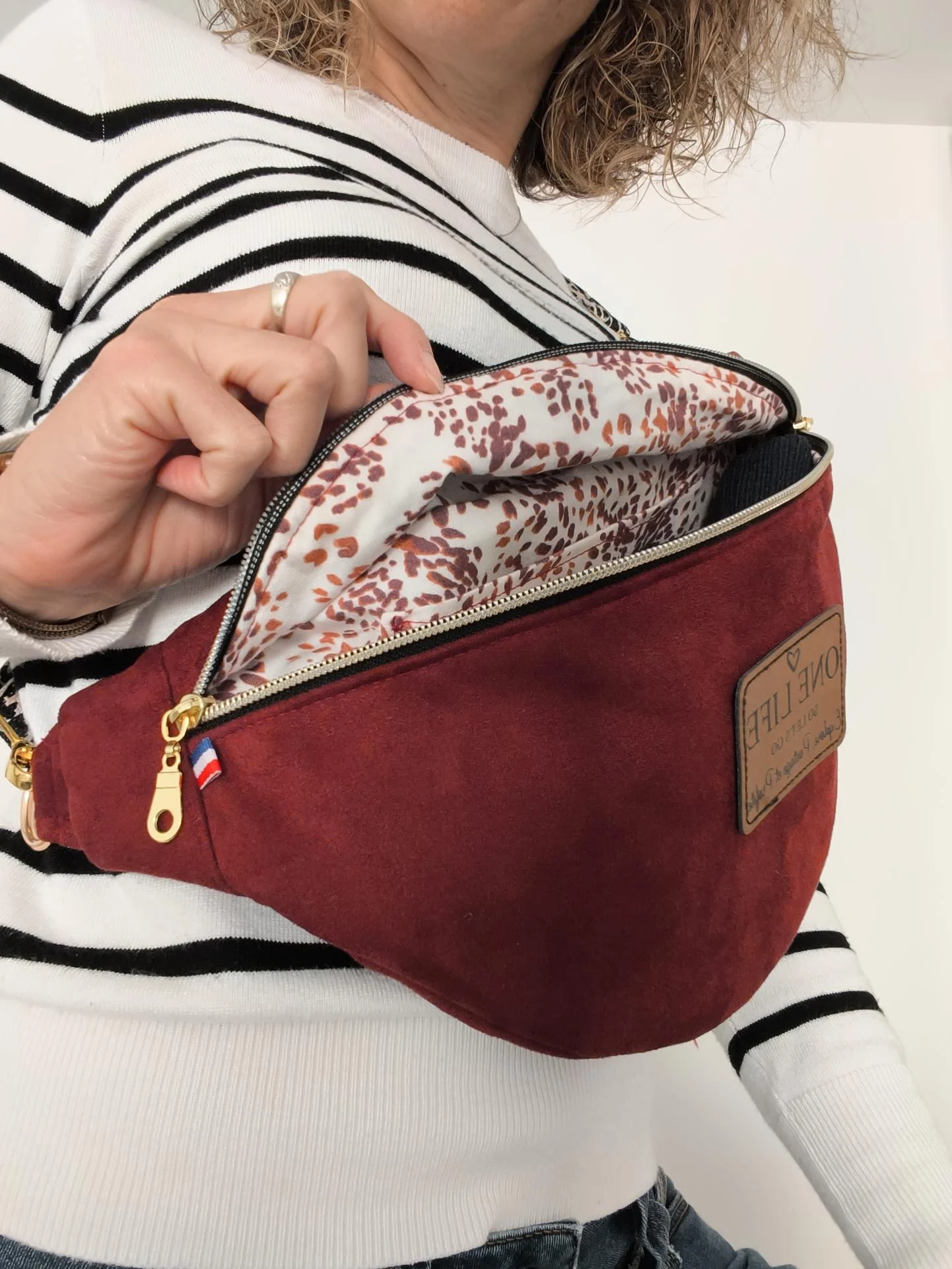 Tissu suédine bordeau exterieur et un interieur motif pois, sangle léopard